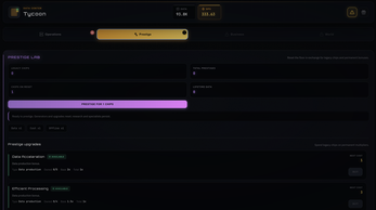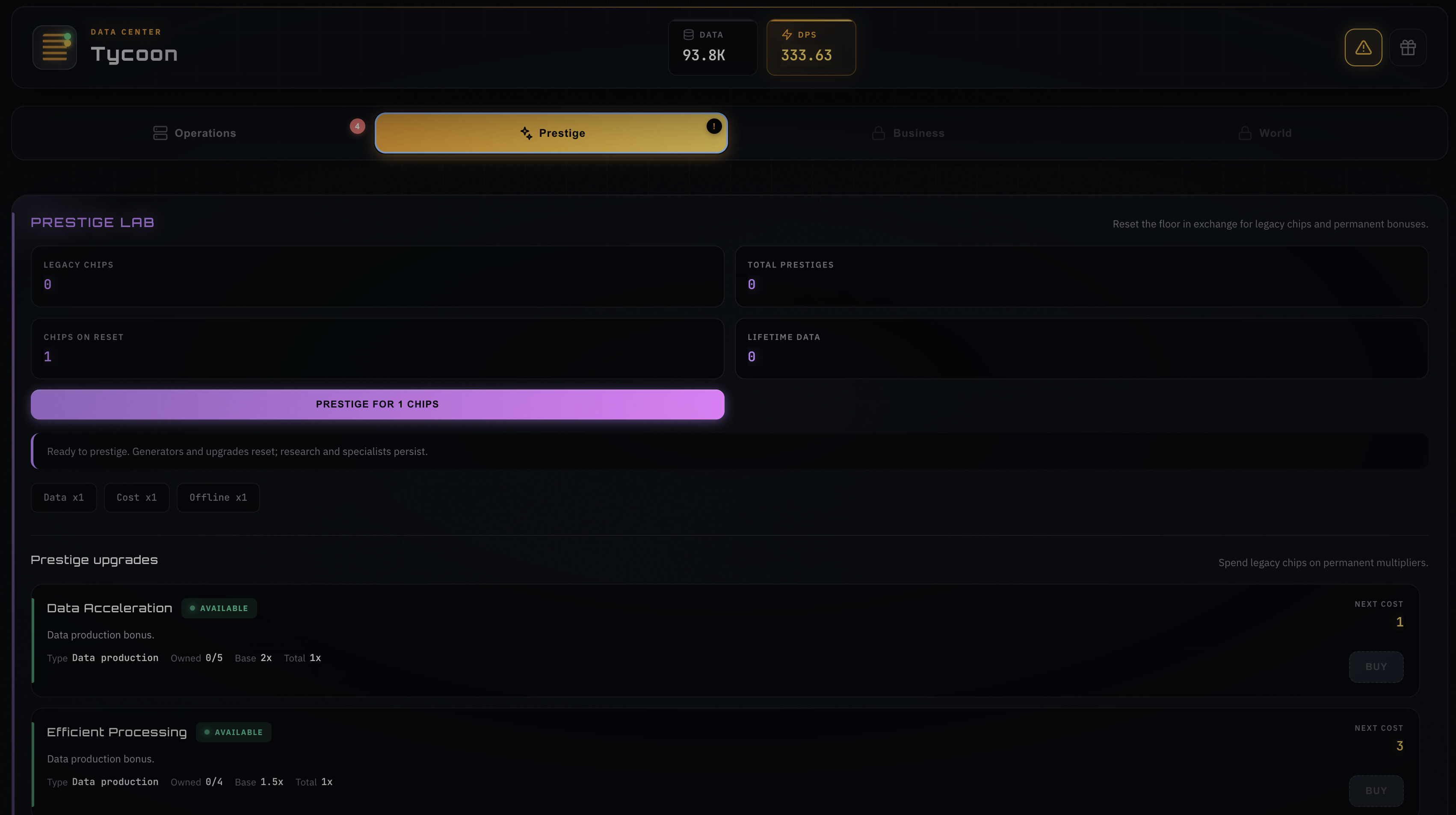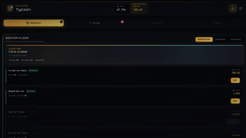 Data Center Tycoon is an idle/incremental game about scaling server infrastructure from a humble 1U rack to massive server farms. Buy generators, unlock automation, research upgrades, and prestige for permanent bonuses.