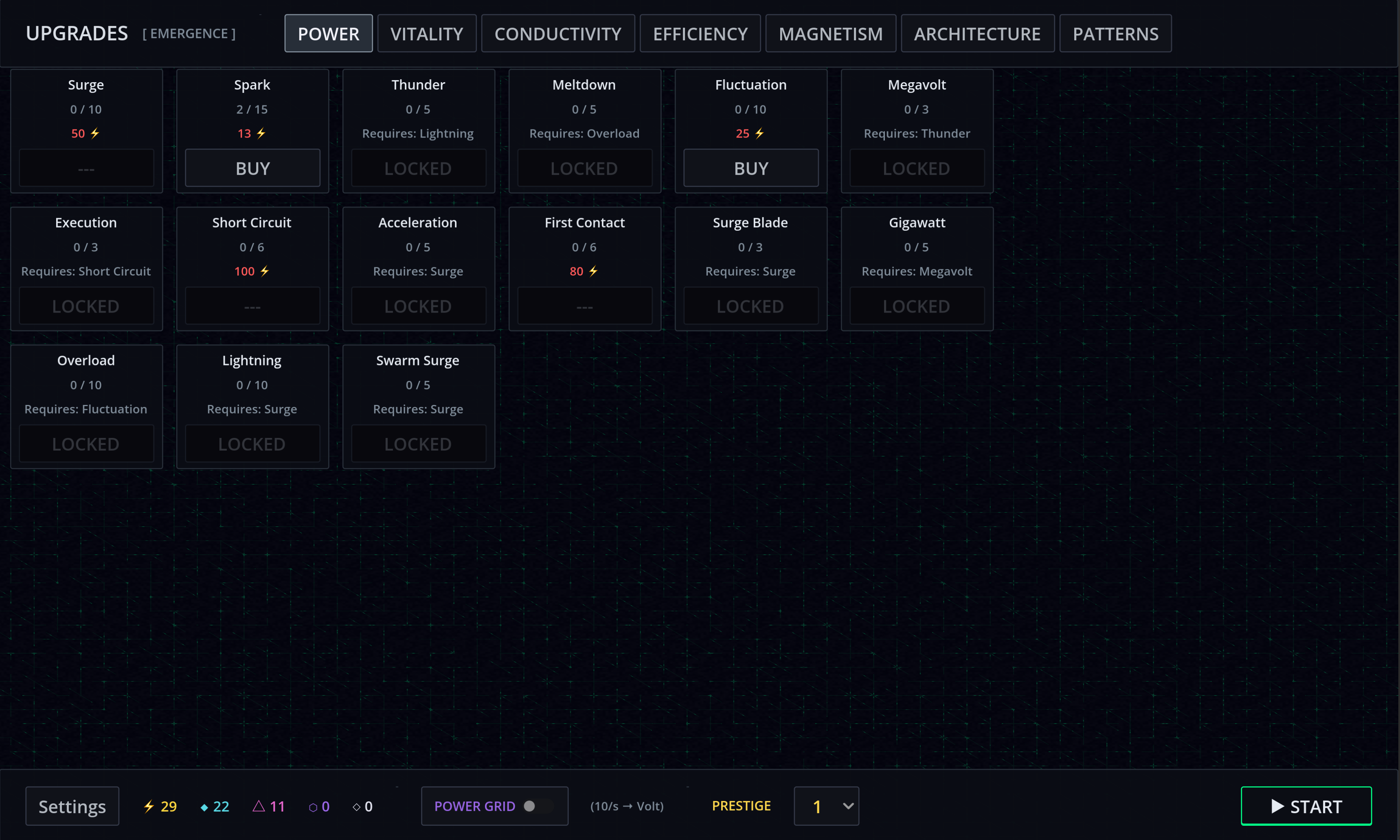 - Upgrade — Spend 6 currency types across 80+ upgrade nodes in 7 branches: Power, Vitality, Conductivity, Efficiency, Magnetism, Architecture, and Patterns.